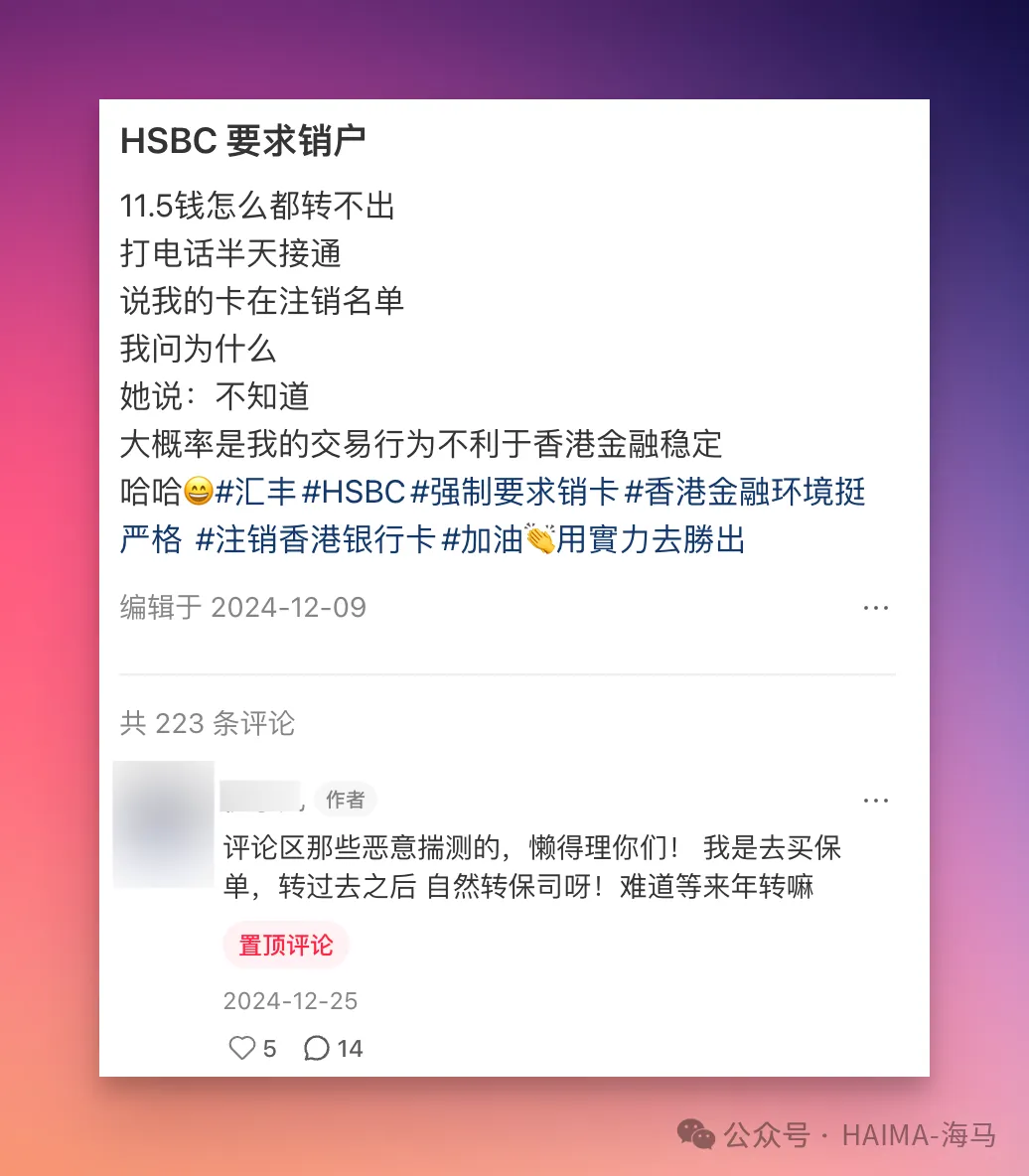 最近我的微信好友中,还有在各个平台看到汇丰的账号被封号了;很多人总是把咱们大陆使用银行账户的习惯,用到了香港银行上。